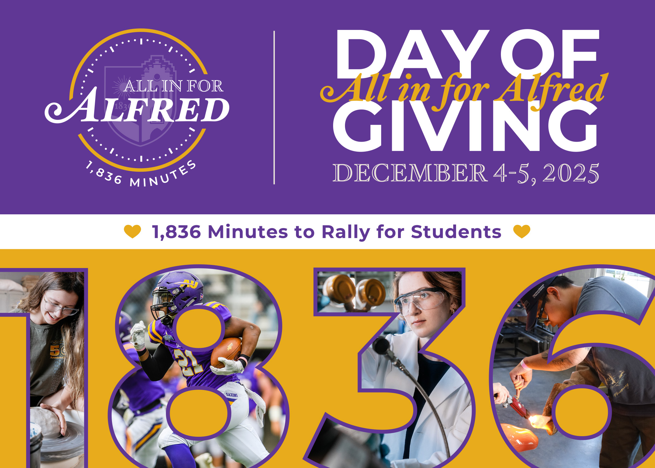 Alfred University’s third annual “All In for Alfred” Day of Giving returns this December, uniting the Alfred community for 1,836 minutes of giving—from 8 a.m. on December 4 to 2:36 p.m. on December 5.