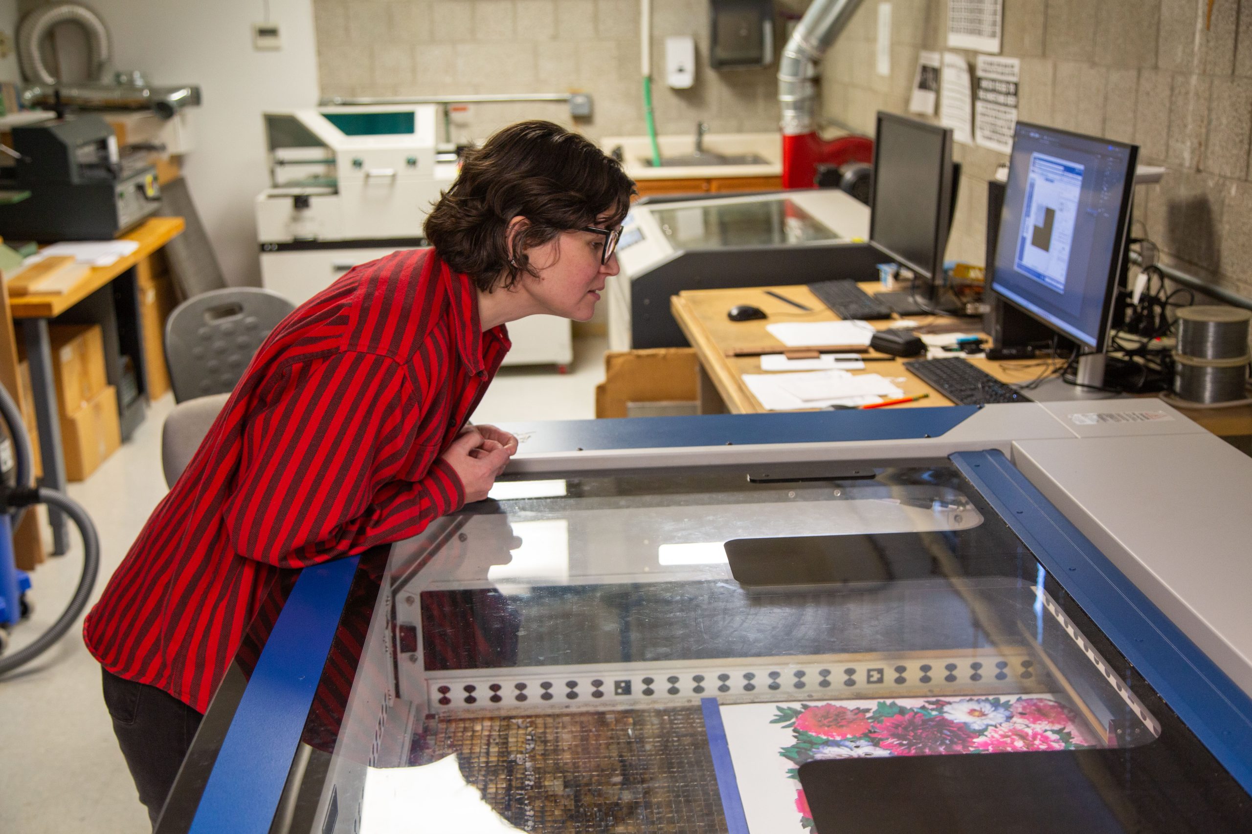 Elizabeth cutting screen printed floral collages using Expanded Media’s Epilog Laser.