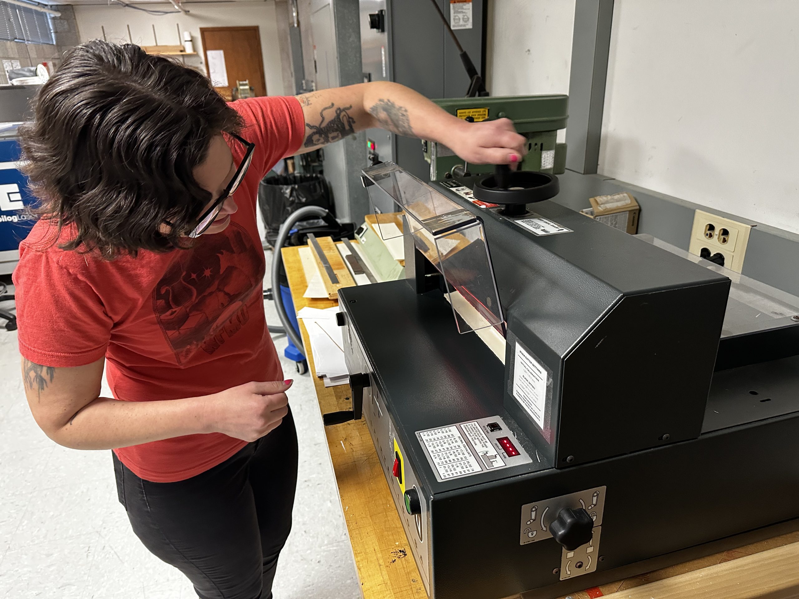 Cutting paper before using the Sterling Digibinder to perfect bind Dream Palace.