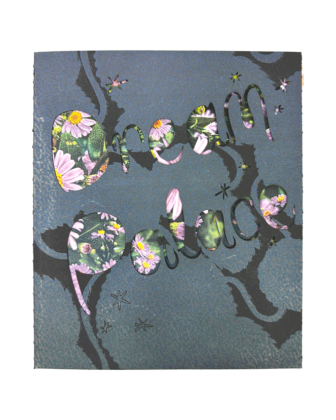 “During the second week I began working on an artist book, something I initially thought was unrealistic to accomplish in the amount of time I had. Being open to using digital printing made it possible. The book has dozens of combinations of layered photos, printed patterns and cut paper made on a variety of different papers. The limited amount of time meant I had to make decisions relatively quickly about how to pair and combine the many different components, intuitively pairing the pieces I thought worked together, to create overlapping layers of photo, silkscreen printed patterns and cut paper that reveals small glimpses of the pages/layers before and after each page. Created during a whirlwind of a residency, mostly in the middle of the night, rather than sleeping, but imagining relationships between blossoming florals, the body, and repetition of pattern overlapping pattern and the cutting through as ways to turn them inside out and create through lines of connection between images, the resulting book is called Dream Palace… This project was very generative for me, helping me envision combinations and possibilities that I had not considered before. This will become an edition of 10 books in itself, but I also see this as seeds for other future book projects as well as the installation work I had originally planned to make.
