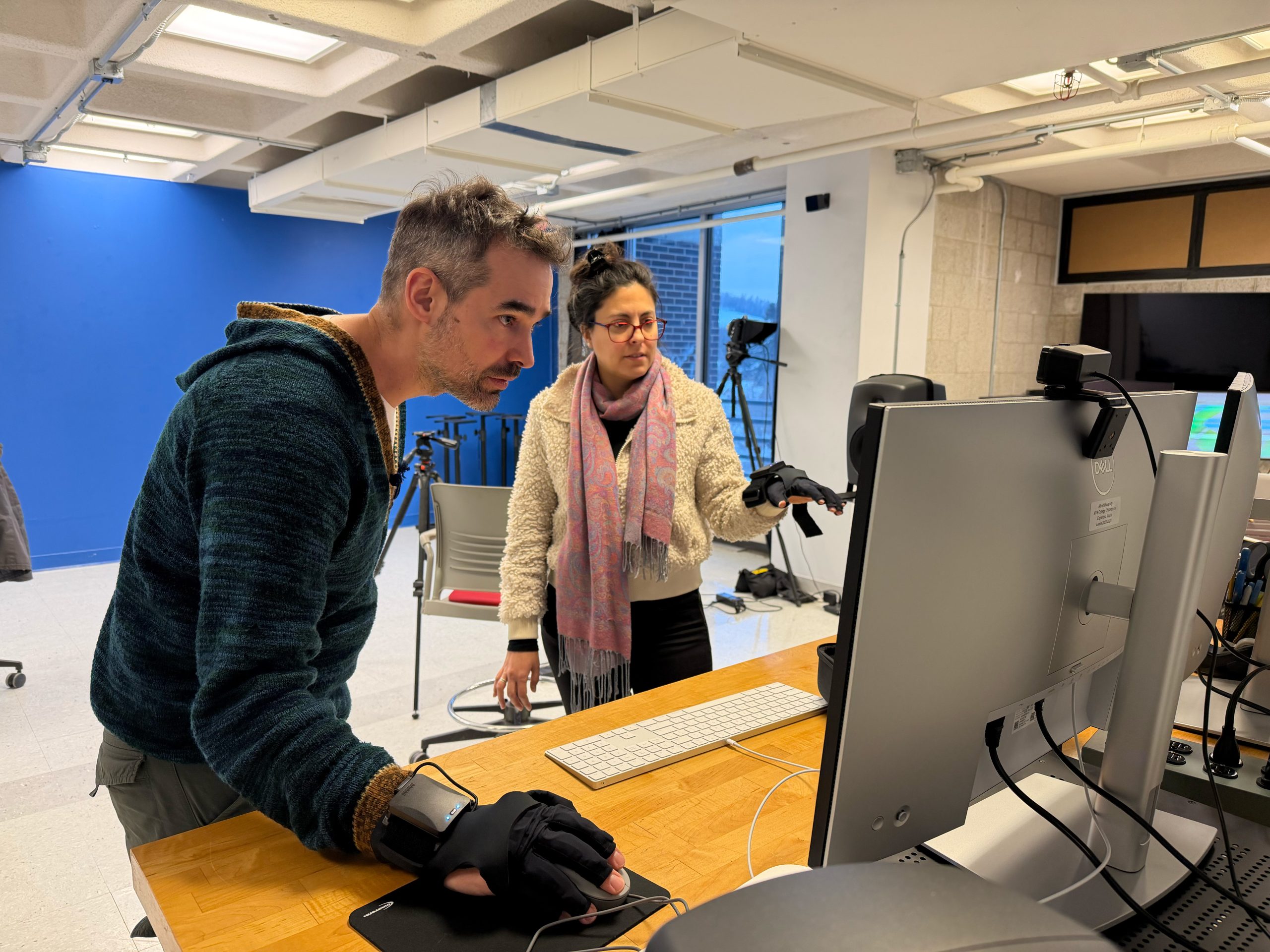 Lihuen and Visiting Assistant Professor of Music-Sound Studio, Matias Homar testing the iea’s new MiMu Gloves.