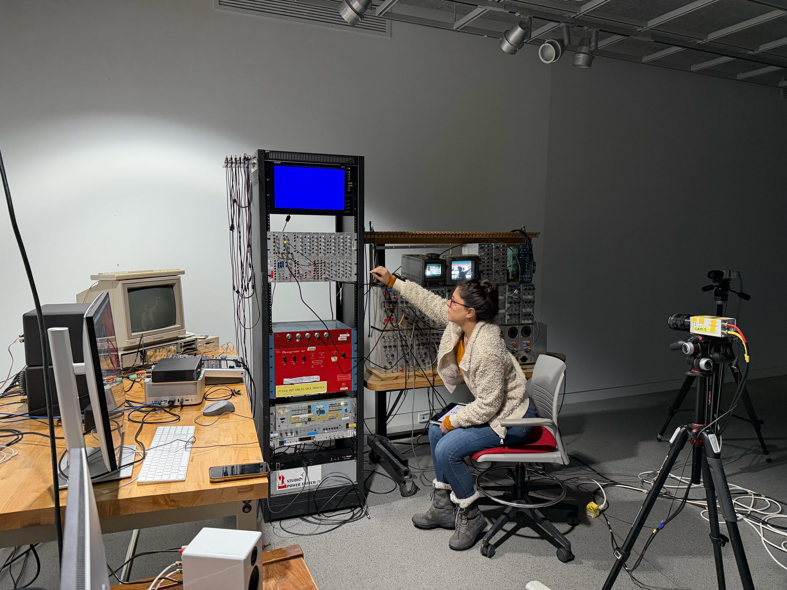 “During the residency, I worked with two video synthesizers: the Sandin Image Processor and the LZX Double Vision. I used similar techniques on both systems, primarily working with camera input to generate video feedback, equivalent patching approaches, and routing the synthesizers’ outputs into a Doepfer modular system to process sound. This allowed me to produce aesthetically consistent material, using shared methods across different tools that operate with analog video as a medium but originate from very different historical moments. The Sandin Image Processor dates from the mid-1970s, while the LZX Double Vision is a contemporary video synthesizer. By working in this way, I was able to observe which aspects of my practice emerge independently of the tools themselves, and which qualities are specific to the “personalities” of each system. The project became an exploration of continuity and difference across generations of analog video technology, revealing both my own artistic traits and those embedded in the instruments.”