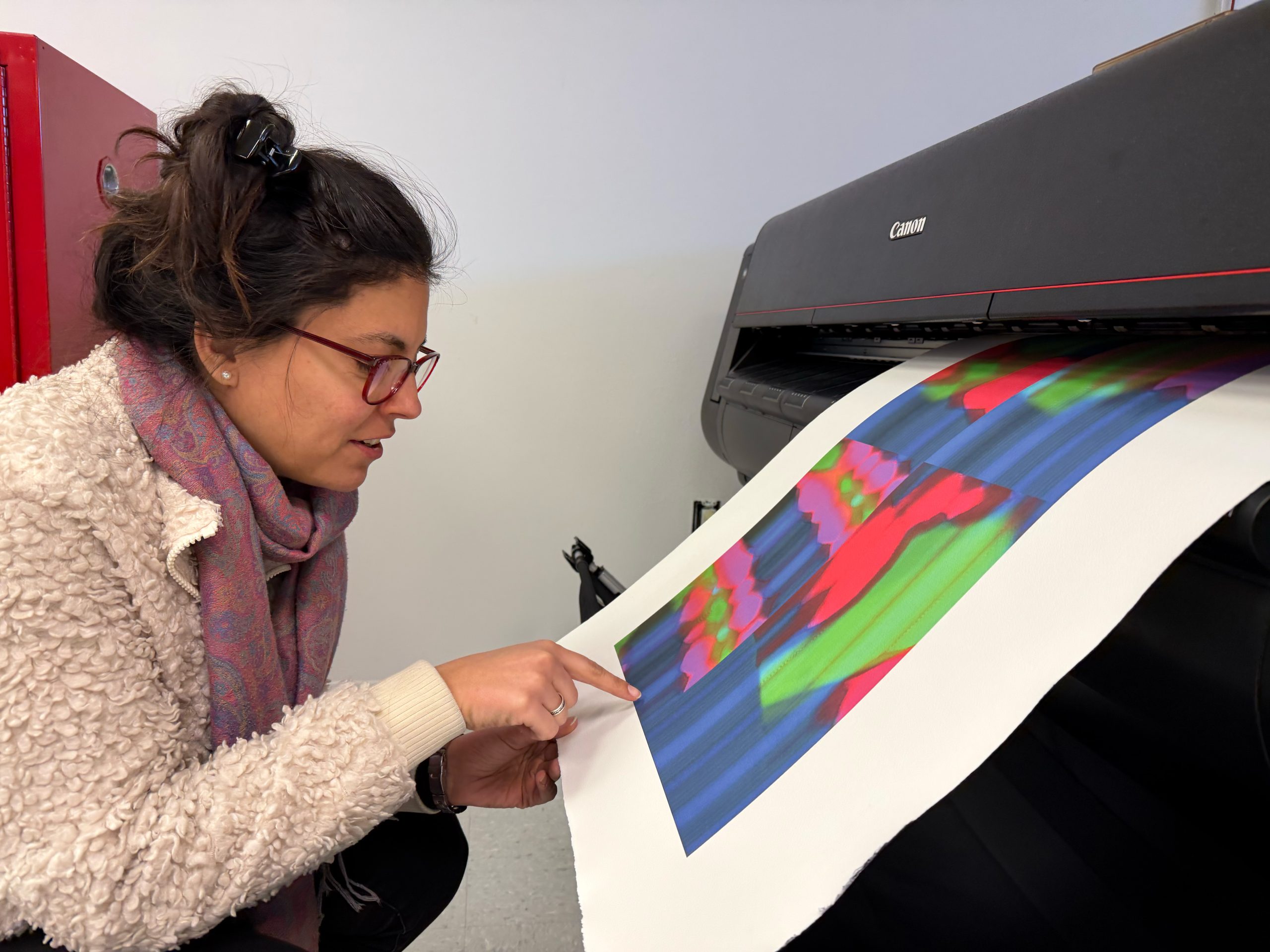 Lihuen printing images made during her residency.