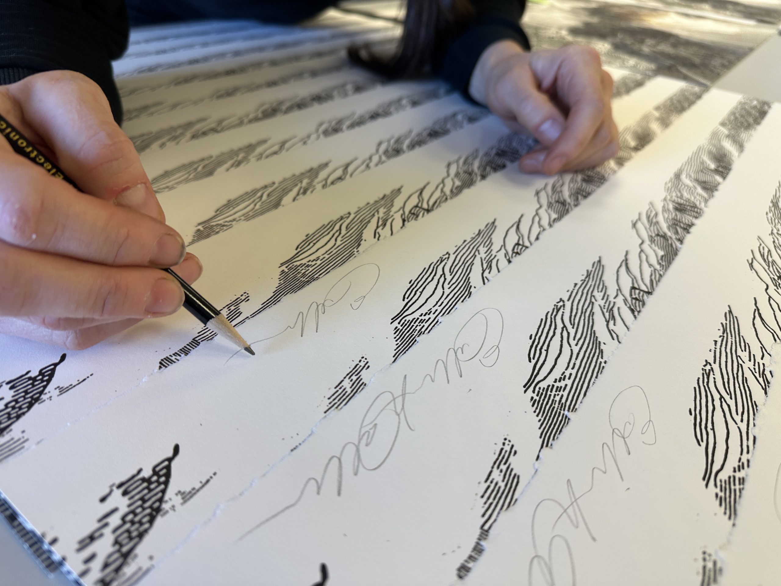Signing prints.