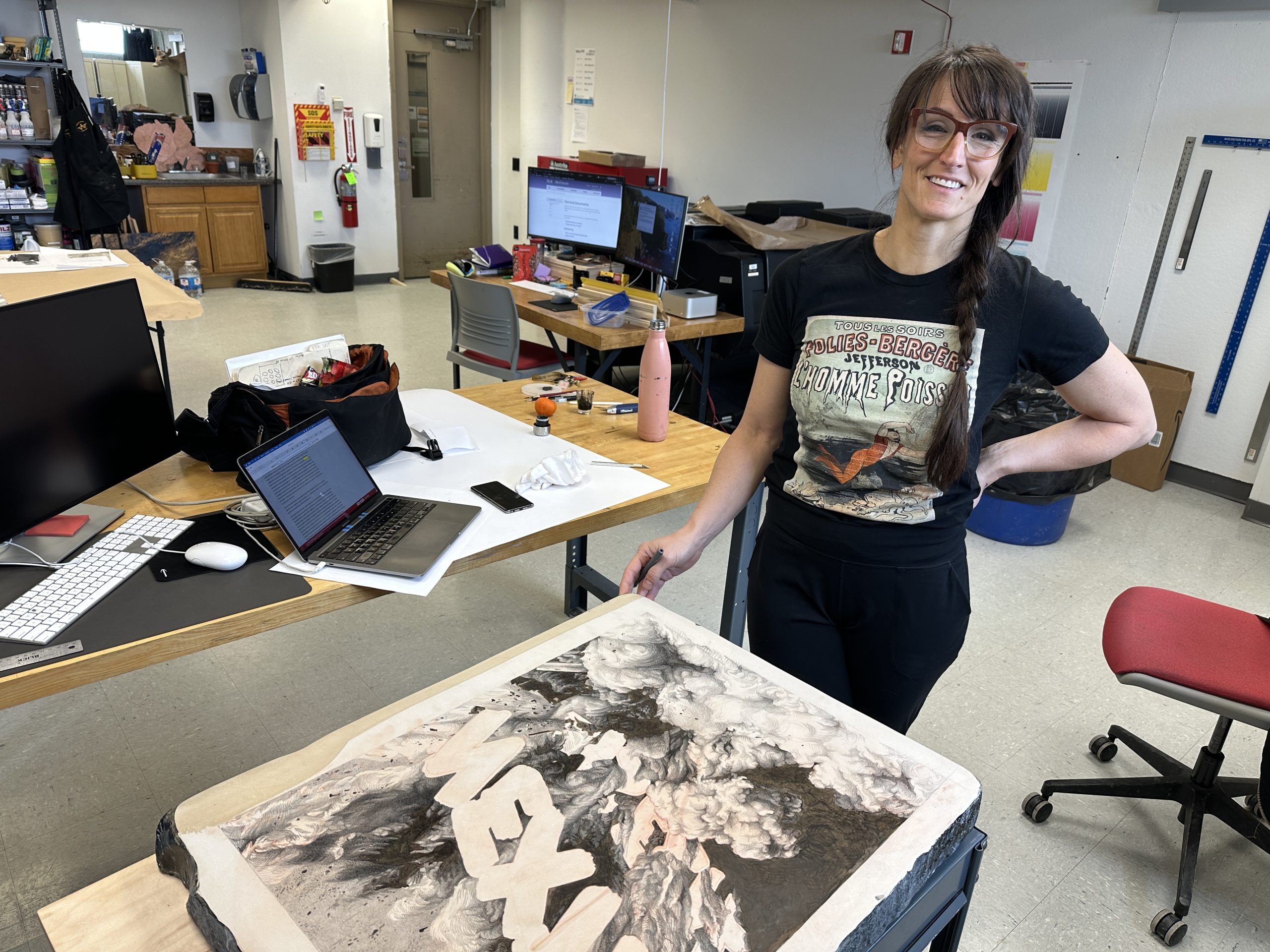 “We accomplished a great deal, far more than I could have on my own which is what made this residency so valuable. We produced an edition of a ten foot long relief print, an edition of a five colour diptych (also a relief print), an edition for an exchange portfolio, and a 3 colour, hand drawn lithograph. It’s a challenge for many studio artists to access the time and support to create work with new to them technology. Without the support prior to arrival and the technical guidance during the residency, I would not have explored the potential of combining hand carving and laser engraving in the same work.